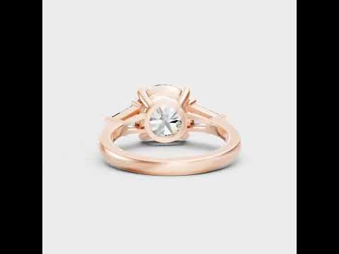 This IGI/GLI Certified 3.38 Carat Round and Baguette-Cut Lab-Grown Diamond Three-Stone Ring features a commanding center stone flanked by sleek, architectural baguettes for a sophisticated interplay of light.